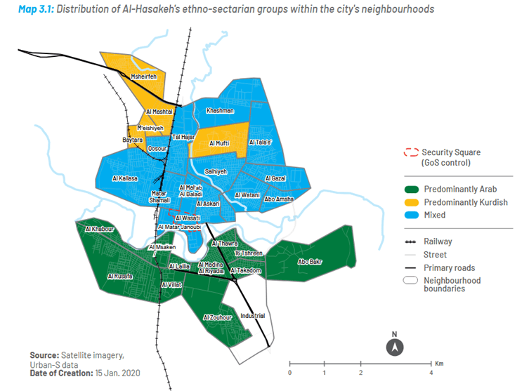 Hasakah city has a large Kurdish minority (42 percent), the majority mostly Arab with a small population of Assyrians. But there is a clear geographic separation, the Arab population predominantly living in the southern neighbourhoods, Kurds in the north, while the central neighbourhoods have mixed populations: