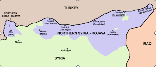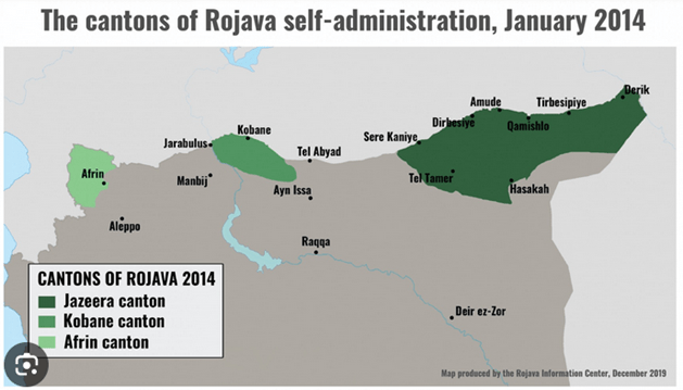 Figure 8: The cantons of Rojava self-administration, roughly 202-2014