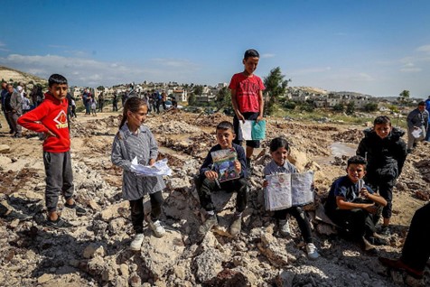 Ceasefire? Palestinian children inspect the rubble of their demolished school in Jib al-Dib.