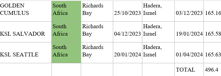 South Africa, however, was widely commended for its genocide case against Israel at the International Court of Justice, but till now has also had extensive trade relations with Israel, exporting $350.9 million to Israel in 2022, of which 40 percent was coal, and as shown below, nearly 500,000 mt of coal since October: