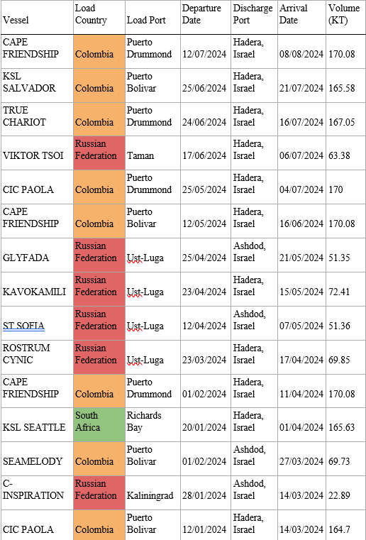This data from LSEG Data and Analytics, showing coal shipments to Israel in 2024, reveals the large role of Russian coal in sustaining Israel’s regime; unfortunately seems to show that Colombia’s boycott has not been put into practice as of July; does not show Chinese shipments as claimed by S&P Global, Source: https://docs.google.com/document/d/1rKdD_nWe5o4YQ3YYXUGkSsXQT4JO0DQ5cAxJ5OYyzeU/edit