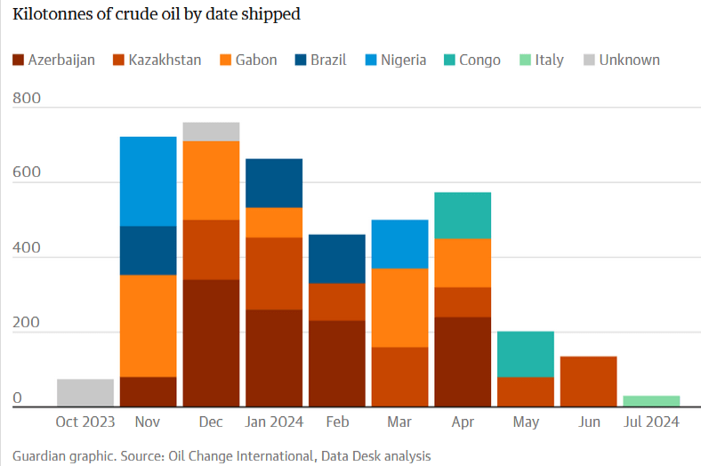 As we see in the chart above, in July-September 2023, CPC supplied some 40 percent of Israel’s oil imports; while it has fluctuated since, in January 2024 it still accounted for some 40 percent of the total. The data shows that at least 600kt of Kazakh/Russian crude has been shipped to Israel since October via the CPC. This later chart based on data from Oil Change International, shows this has continued through 2024, the CPC supplying some 40 percent of Israel’s oil in March and 100 percent in June: