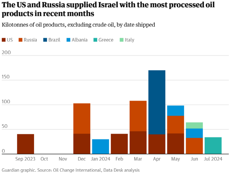Russia and the US have also been the main suppliers of processed oil products to Israel over the last year, on some months Russia ahead of the US, though both were surpassed by BRICS member Brazil in April: