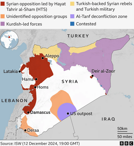 A few tens of thousands of troops that HTS and its allies had may have been adequate as a security force for the northwest corner of Syria, but once in control of a country of 23 million people, it is in a weak position. The government currently only controls part of Syria, most of the Sunni Arab heartland running down the west of the country from Idlib and Aleppo in the north, through Hama and Homs, down to Damascus. Regarding the rest of the country: