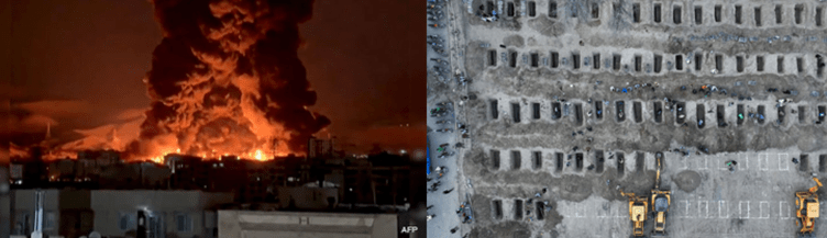 The wanton criminality of this war – Left: Scene from Israel’s attack on Iranian oil storage depots; Right, some of the graves of 165 schoolgirls killed in US bombing of elementary school.